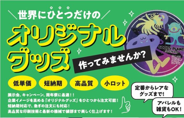 同社は豊富なアイテムの中からオリジナルのデザインで各種イベントのノベルティや記念品、物販品などのグッズ製作を行っている。国内自社工場で製作しているため、高品質なグッズを短納期で仕上げることができるのが特徴。大ロット注文はもちろん小ロットにも対応。新しいアイテムも追加し続けているので、流行のグッズを注文したい人は相談してみよう。